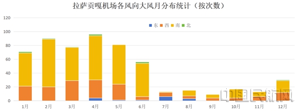 每年11月至次年4月为拉萨贡嘎机场干季,5月为过渡季。在冷性高压的控制下,受副热带西风急流影响,拉萨贡嘎机场大风天气频繁,且随着温度的逐渐升高,大风次数和风速逐渐增多、增大,直至6月进入雨季后才开始减少。
