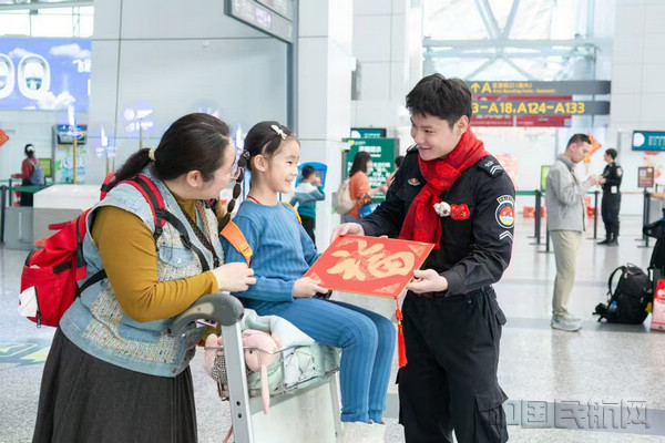 节日期间,安检人员为旅客送“福”字(戴穗恩/摄)