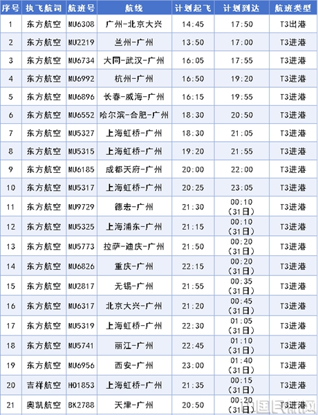 首批进驻航空公司10月30日在T3航站楼运营的具体航班为: