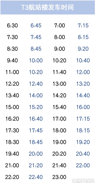 T3航站楼公交线:线路单程约6公里,用时约15分钟,发车间隔为15-20分钟。