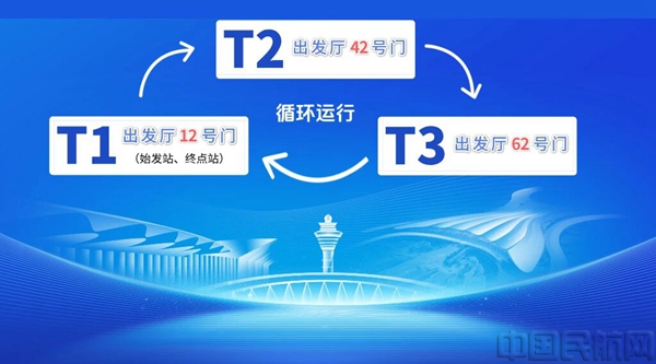 线路站点:T1出发厅12号门(始发站)→T2出发厅42号门→T3出发厅62号门→T1出发厅12号门(终点站),循环运行。