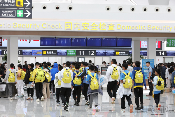 青少年研学团队准备登机,参与研学活动(张斌/摄)