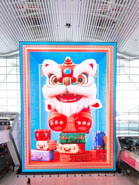 春运期间,“大湾鸡”快闪、长隆巡游、非遗剪纸、挥春送福、粤剧表演、时装秀等特色活动将轮番上演,为旅客带来不一样的候机体验。2月17日(大年初一),三座航站楼将举办醒狮表演,为广大旅客送上新春祝福。除夕夜为旅客送上热气腾腾的水饺,元宵节联合多家餐厅免费为旅客赠送汤圆,部分岗位员工还将着汉服上岗,让旅客沉浸式感受传统年俗魅力。值得一提的是,T2航站楼启用全球最大航站楼裸眼3D大屏,高33米、宽25米,总面积达825平方米,循环播放《广州开启未来之门》《广货行天下》《醒狮献瑞》等充满岭南特色的主题内容,生动展现“请到广东过大年”“广货行天下” 的文化自信与商贸活力。