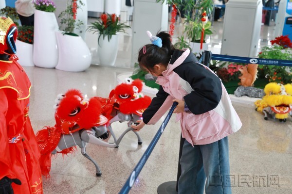 “科技舞狮拜年啦!”“宁波栎社机场祝您新春大吉!”伴随着机器人的语音祝福,现场瞬间成为欢乐的焦点。孩子们兴奋地追逐互动,大人们纷纷举起手机,记录下这新奇又喜庆的一幕。