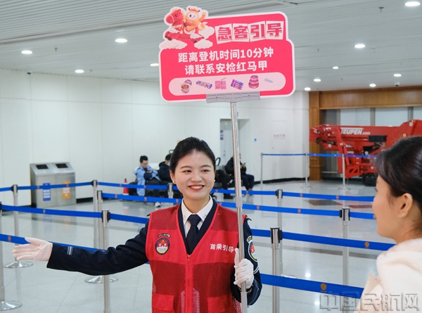 其中,针对急客、首次乘机旅客,福州机场安检在待检区设置萌趣“福宝”引导牌,工作人员主动靠前问询、一对一快速引导,帮旅客高效理解安检流程。