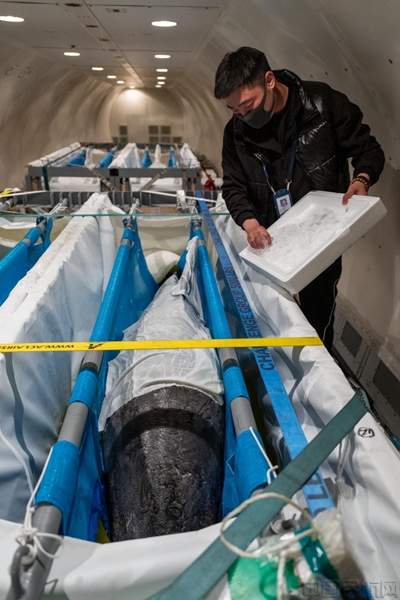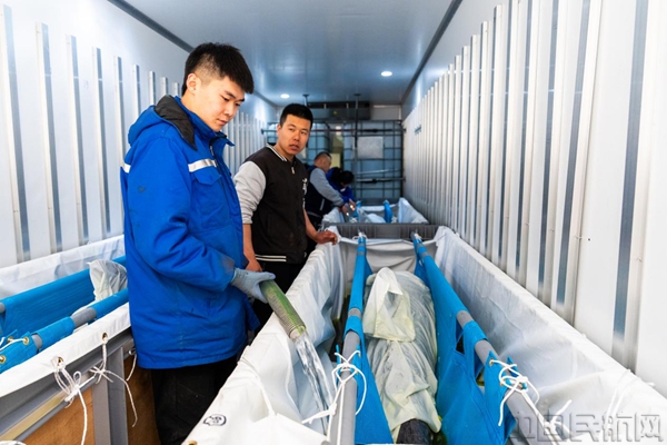 活体海豚运输对环境、时效及操作精度要求极高。运输过程中,海豚被安置于专用敞开式水箱内,身体缠裹保湿绷带并保持固定姿势,以降低应激反应。飞机抵达后,机场保障团队第一时间为海豚补水降温并监测健康状况,严格执行特种货物操作规范。从舱门开启到完成卸机仅用时11分钟,大幅压缩了海豚在机场的停留时间,有效降低了应激风险。
