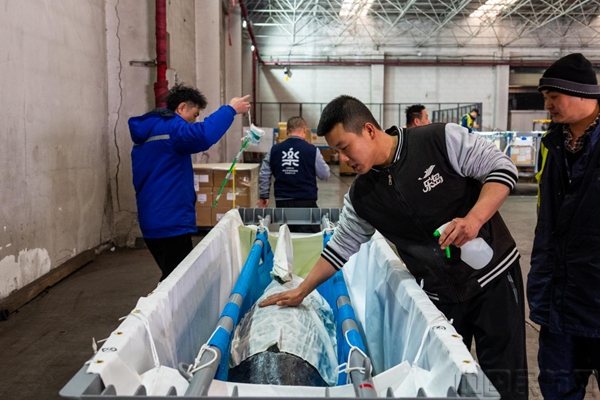 工作人员将海豚转运至货站
