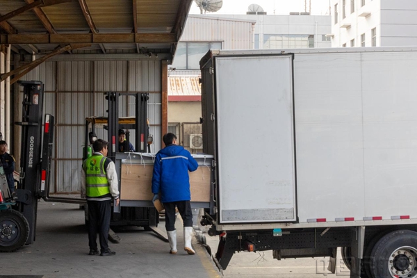 在天津滨海机场货站,工作人员操作叉车将载有海豚的专用运输水箱平稳转运至专用运输车辆