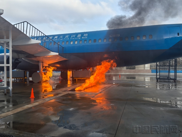 此次培训是天智校区C919机型1:1模拟航空器真火实训系统建成后的首期培训。该系统严格按《航空器消防救援真火实训系统建设规范》建造,机身长38.9米、翼展35.8米,设有驾驶舱、客舱、货舱、发动机、起落架等9类15处真火点,可模拟机身火、发动机火、流淌火等多类复杂场景下的火情。系统最大亮点在于其复合型设计——在C919客机模型基础上,额外集成B757-200货舱模型,两种机型组合建设,既能满足客舱火灾训练需求,又可开展货舱真火实战演练,实现了“一机两用”的培训效能。系统还采用耐候钢与不锈钢材质,具备快速破拆更换模块,可反复开展真火实战训练。参训指挥员能够在逼真火场环境中,完成火情研判、战术部署、破拆救援、多车协同等全流程演练,有效提升应急处置能力。