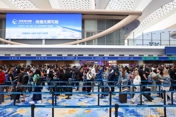 当天10时许,记者在广州白云国际机场观察到,口岸已是人流如织、一派繁忙。来自世界各地的客商在白云边检站移民管理警察的指引下有序候检,人潮如织,尽显开放中国的活力与自信。