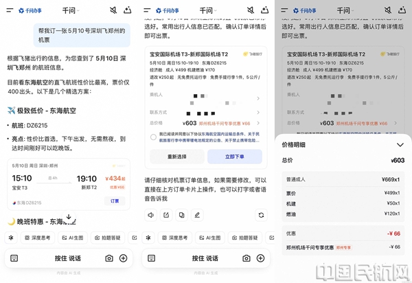 例如,当用户对千问APP说“帮我订一张5月10日深圳飞郑州的机票”,它即刻理解用户意图并推荐了HU7735、CZ6336、DZ6215、DZ6277四个不同时刻起飞的航班,4张机票均有66元“郑州机场千问专享优惠”,点击具体航班卡片即可进入确认和支付环节。