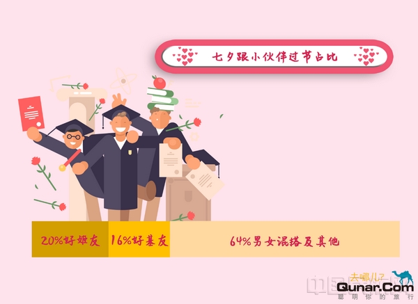 不过在这样难得的日子里,在去哪儿平台上,四分之一的人劳燕各自飞、两成人选择和同性朋友出去浪,真正手牵手过七夕的情侣只有10%。