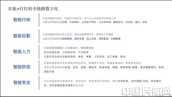 自2021年与钉钉携手以来,东航北京地面服务部与钉钉全力以赴共创共赢,思索脚下发展之路,致力于探索未来方向,为数字化转型注入新动能、新活力,赋予韧性内核价值,积累了深厚的数字潜能,通过业务线上化的数字集成模式,实现互联互通,让信息找人、让事情找人,打造敏捷管理组织,更重要的是,东航北京地面服务部从第一次接触钉钉开始,先后历经第一次数据互通、第一次组织在线、第一块数字大屏、第一次业务在线,从无到有,逐渐形成了东航北京地面服务部自己的数字化认知体系、实现路径和实践成果,以宜搭为主推动器,不断壮大地面数字运行体系,有力促进东航北京地面服务部内外数据互通、共享。