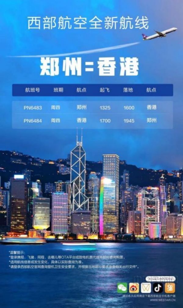 西部航空计划于12月15日开通往来郑州与香港的定期航班,这是中国大陆地区低成本航司首次连接河南省和香港,也是自疫情以来西部航空在中国大陆地区全新开通的首条国际及地区定期客运航线。该航线的开通将进一步促进河南省与香港之间的商业、旅游文化交流及两地居民的友好往来。