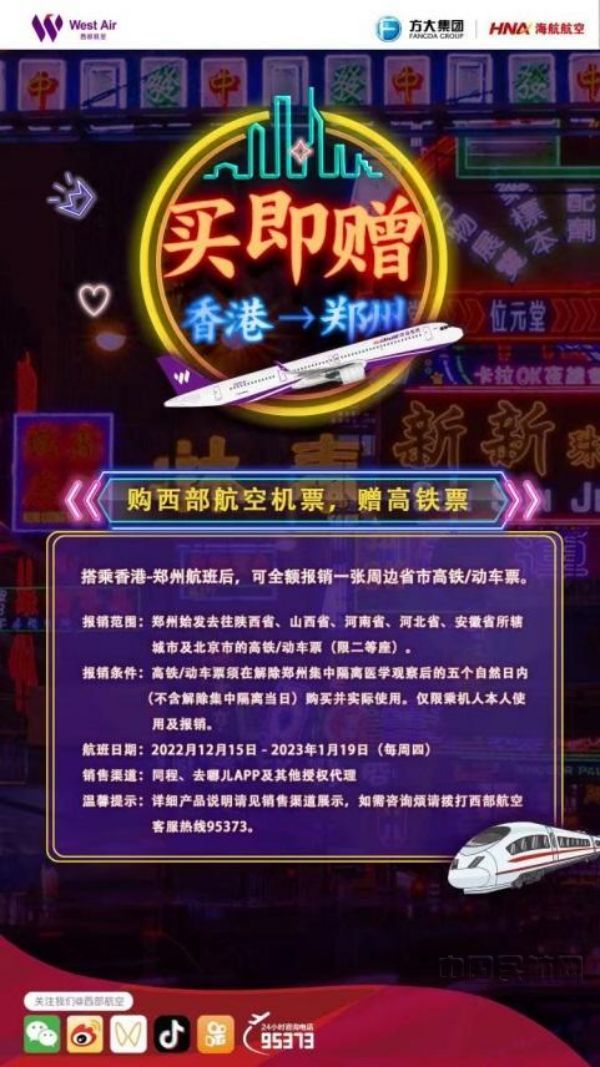 作为中国领先低成本航空,开航初期西部航空特别推出“买即赠”机票产品,让旅客出行更加实惠、便捷。旅客通过同程旅行、携程旅客及去哪儿网等机票销售平台购买西部航空香港至郑州机票的旅客,在搭乘航班后,可全额报销一张周边省市高铁/动车票,让旅客可以以实惠的价格体验西部航空广阔的飞行网络以及贴心的服务。除此以外,西部航空还将提供更亲民的机票价格,旅客可以以更低的价格购买裸票,根据自身需要,在西部航空官方渠道自助购买托运行李额及机上餐饮。