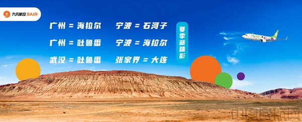 《中国民航报》、中国民航网 记者郭瑛 报道:随着2023年暑运临近,为进一步满足广大旅客的出行需求,九元航空陆续开通了张家界—大连、广州—海拉尔、广州—吐鲁番、武汉—吐鲁番、宁波—石河子、宁波—海拉尔航线,为旅客畅游国内各地提供便利。具体航班信息如下: