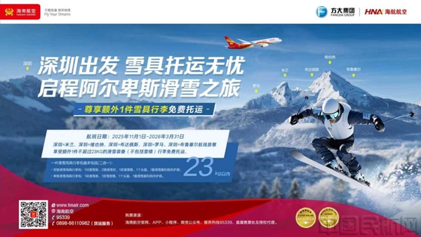 《中国民航报》、中国民航网 记者李季威 通讯员唐啸啸 报道:自2025年10月26日起,新海航航空集团旗下海南航空正式执行冬春航季航班计划。新航季中,海南航空在深圳新增3条国内航线,加密部分热门航线航班频次,并增加宽体机投放。同时,针对5条深圳往返欧洲的滑雪航线推出滑雪装备额外免费行李额度,进一步丰富旅客出行选择,提升乘机体验。