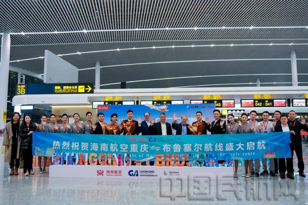 中国民航网 通讯员彭灿、梁辛元 报道:11月22日北京时间02:45,HU469航班从重庆江北国际机场顺利起飞,标志着新海航旗下海南航空重庆—布鲁塞尔国际航线正式通航。11月22日凌晨,海南航空在重庆江北国际机场T3航站楼举办了重庆—布鲁塞尔首航航班送机仪式。比利时王国驻华大使安博宁(Bruno Angelet),总领事席迪安(Christiaan SYS),海航航空集团副总裁、重庆方大航空国际总部总裁兼海南航空董事长祝涛向首航机组献花并合影留念,共同庆祝重庆—布鲁塞尔航线顺利启航。该航线的开通将为两地经贸往来注入新动能,更将搭建起两国人文交流的桥梁。
