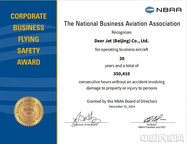 金鹿公务凭借超过35万小时安全飞行时间荣获Corporate Business Flying Safety Award飞行安全奖