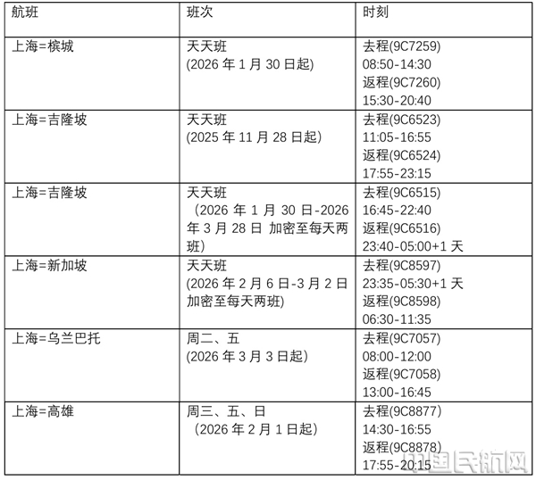 《中国民航报》、中国民航网 记者钱擘 报道:春秋航空宣布,自2026年1月30日起,正式开通上海浦东往返马来西亚槟城的每日直飞航线。