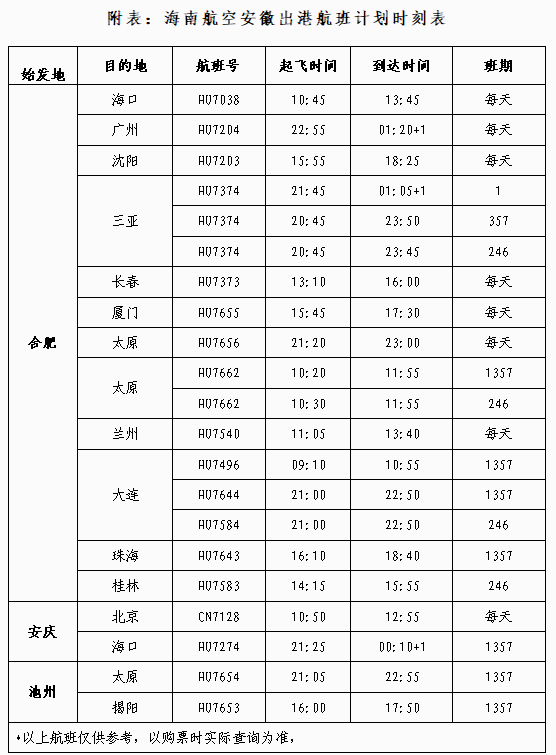 据悉,新开通的太原—池州—揭阳航线每周执行四个往返航班,班期为每周一、周三、周五、周日。去程航班HU7653于13:15从太原武宿国际机场起飞,15:15抵达池州九华山机场,之后于16:00再次起飞,17:50抵达揭阳潮汕国际机场。返程航班HU7654于18:35从揭阳潮汕国际机场起飞,20:20到达池州九华山机场,21:05再次起飞后,于22:55抵达太原。航班时刻信息以购票时实际查询为准,旅客可通过海南航空官网、App或各大售票平台查询及购买。