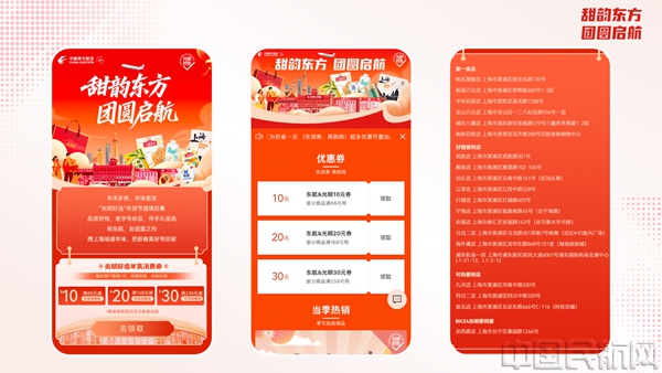 在线上,旅客可通过东航APP、小程序及“光明好选”小程序领取10元至30元不等的满减券,用于在“光明好选”平台购买商品,满58元即可包邮,将心意直送到家。