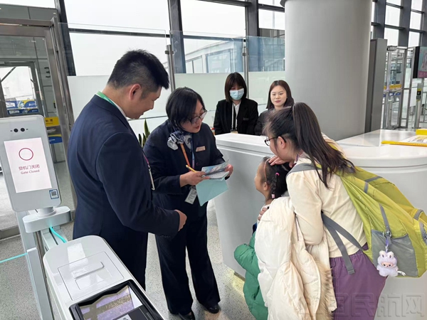 登机前,工作人员仔细核对小旅客的航班号、目的地及证件信息