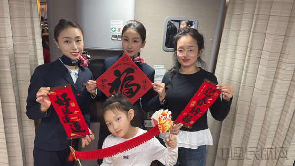 旅客登机伊始,新春氛围便扑面而来。机组人员佩戴精致新春装饰,在登机口微笑等候每一位旅客,手持“金鞍贺岁 云端同行”、“马到成功 新春快乐”等马年主题板热情互动,暖心的新春祝福伴随笑容传递。