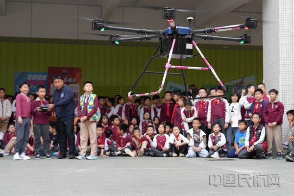 当一架六旋翼无人机在操场上腾空而起,螺旋桨的嗡鸣声瞬间点燃了学生们的热情。在专业教员的指导下,3名学生代表手持操作台,在模拟飞行系统中学习无人机操控技巧,感到紧张又刺激,教员手持教练机确保操作过程安全。“老师,无人机能拉起来多重的东西?”“遇到大风怎么办?”面对孩子们连珠炮般的提问,南航通航无人机教员纳辉翰耐心解答,并模拟展示特种作业和特情处置方案。