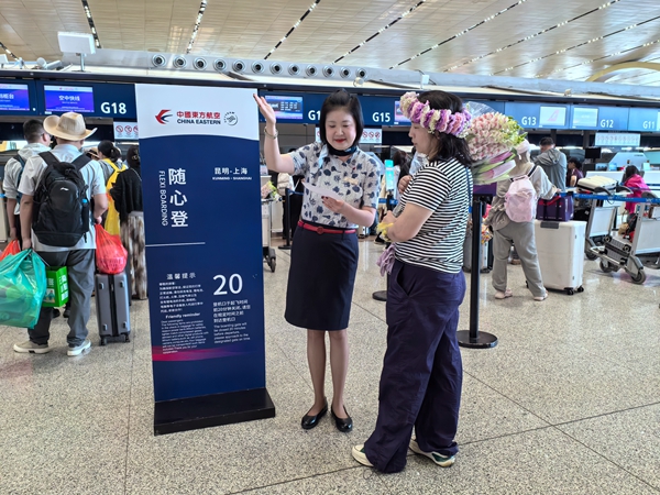 此次上线的“旅客随心登”服务,打破了常规航班值机办理截止时间的约束,全面简化无托运行李旅客出行流程。旅客只需在航班计划起飞前20分钟(登机口关闭前),顺利完成值机、安检及登机全流程手续,即可正常成行。在值机渠道选择上,旅客可灵活安排出行节奏,既可以提前通过线上渠道自助办理值机,也可前往昆明长水国际机场候机楼G15-G18号东航专属值机柜台,由工作人员快速核验身份证件及电子客票信息,高效完成线下值机手续办理;针对行程紧张的晚到旅客,在上述专属值机柜台完成信息核验后,可领取急客标识,不仅能享受优先安检特权,还可免费使用机场电瓶车接驳服务,真正实现值机、安检、登机全流程无缝衔接,让旅客出行更从容、更高效。