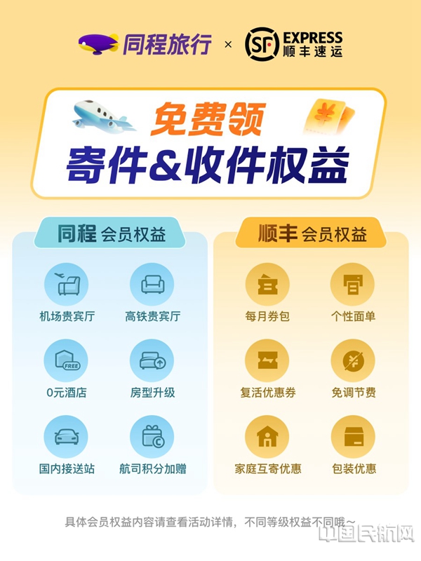 此次合作后,同程旅行会员不仅可继续享受机场及高铁贵宾厅、0元酒店、房型升级、国内接送站、航司积分加赠等旅行特权;还可获得顺丰会员专属权益,包括每月券包、个性面单、复活优惠券、免调节费、家庭互寄优惠及包装优惠等。