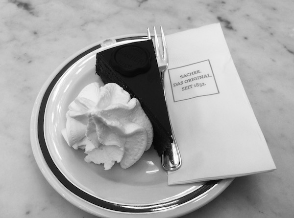 又到黄昏,是急着赶回船吃饭,还是去尝尝赫赫有名的维也纳萨赫蛋糕?我们当然选择了后者。萨赫咖啡店门口照例大排长龙,这家红了180多年的咖啡馆主要的招牌就是萨赫咖啡和萨赫蛋糕。蛋糕由两层甜巧克力和中间的杏子酱构成,蛋糕上面有巧克力片,它是代表奥地利的国宝级点心。而萨赫咖啡则需要淋上酒店特制的含有酒精的巧克力酱,所以味道非常奇特。据说当年茜茜公主也是这家咖啡店的常客。