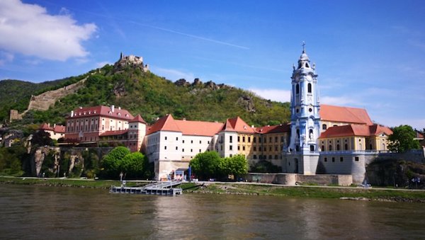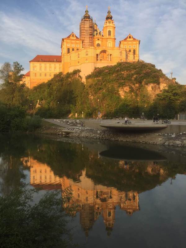中午游轮继续前行,游客们在船上边吃午饭边欣赏两岸的秀丽风光。下午,船靠岸梅尔克,这是一个非常值得一逛的中世纪小镇。镇上最有名的就是屹立在山岩上的始建于1089年的本笃会梅尔克修道院,它被称为世界上最美的修道院,里面有栩栩如生的湿壁画和数量庞大的中世纪珍贵手稿。修道院堪称巴洛克式建筑的杰作,在1702年至1738年间建造,里面的图书馆、教堂都是金碧辉煌、美轮美奂。无论你身处梅尔克的哪个角落,都能看到这座俯瞰多瑙河和整个小镇的金色修道院。黄昏时刻,我们流连在美丽的小镇,品尝冰淇淋,选购纪念品,并把黄昏中的金色修道院倒影慢慢地摄入我们的镜头。